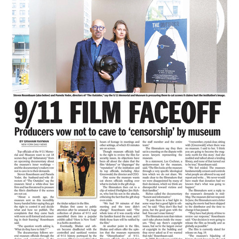 Steven Rosenbaum and Pamela Yoder are the filmmakers behind The Outsider, scheduled for release August 19th—assuming the 9/11 Museum’s team of lawyers hired to torpedo the film do not succeed. As the New York Daily News reports: “Top officials of the 9/11 Memorial and Museum want to cut 18 scenes they call ‘defamatory’ from an upcoming documentary about the museum’s inner workings — and the documentary’s makers vow not to cave in to their demands.”